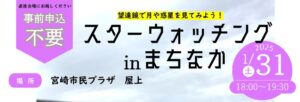 お知らせ ★【スターウォッチングinまちなか】開催のお知らせ 宮崎科学技術館を飛びだし観望会を行う 【スターウォッチングinまちなか】 今回は、宮崎市役所横『宮崎市民プラザ 屋上』で開催! あまり入ることのない“屋上”から望遠鏡を使って月や惑星を見てみよう! 申込不要&無料ですので、お気軽にご参加ください💕 〈日時〉1月31日(土) 18:00~19:30 〈場所〉宮崎市民プラザ 屋上 ※直接会場にお越しください。 詳しくはコチラから