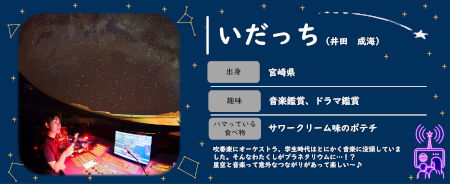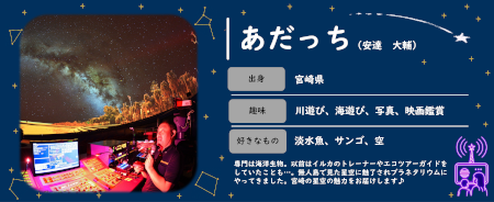 ★ナビゲーターのあだっちといだっちがラジオのように様々な企画(コーナー)で星空をほしとも(リスナーさん)にお届けしていく新感覚プラネタリウム。