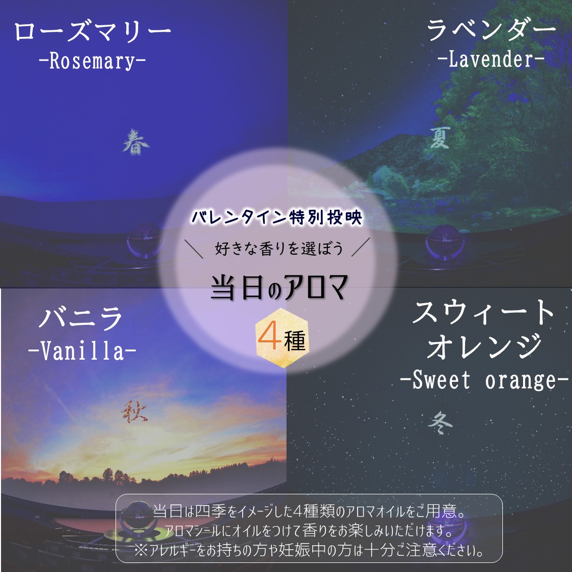 当日は“春夏秋冬”に合わせた、4種類のアロマの香りをご準備。